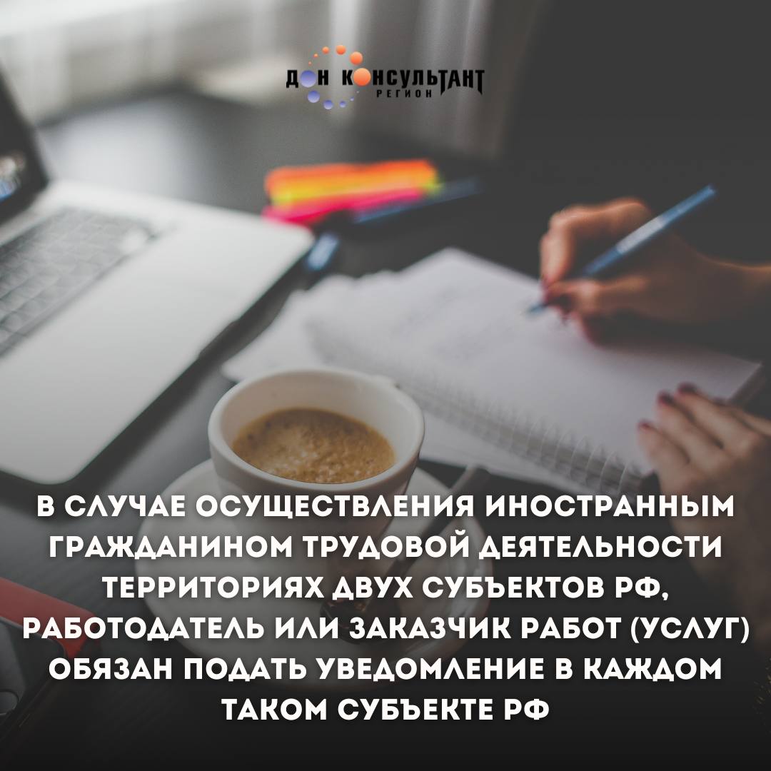 Если иностранный гражданин, в отношении которого уже подавалось уведомление, начинает осуществление трудовой деятельности на территории другого субъекта РФ, уведомление в этом субъекте РФ необходимо подать в течение трех рабочих дней с начала осуществления деятельности.