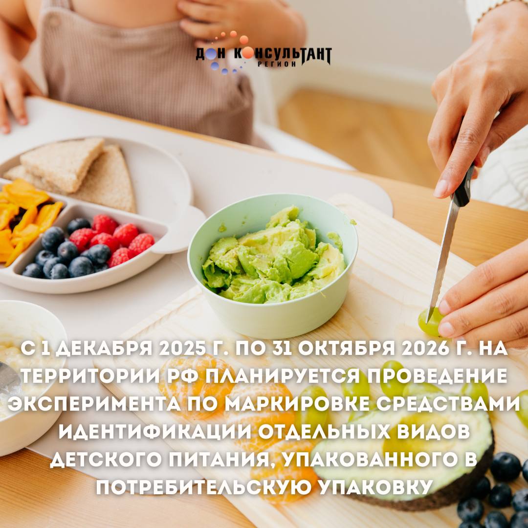 С 1 декабря 2025 г. по 31 октября 2026 г. на территории РФ планируется проведение эксперимента по маркировке средствами идентификации отдельных видов детского питания, упакованного в потребительскую упаковку